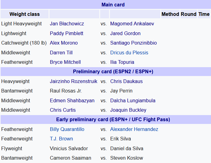 I'm not going to lie to you: I'm a bit bummed out. Teixeira/Procházka was one of the most philosophically interesting fights of the year for me and turned out to be one of the most exciting fights of all time, and as much as I dislike instant rematches for fights with definitive endings, I was excited for the runback. Losing that main event is unfortunate. Giving Paddy Pimblett a co-main event is unfortunate. Inexplicably screwing Glover Teixeira out of a championship match is unfortunate. Scratching Robbie Lawler and Ovince Saint Preux at the last minute are...well, I can't say unfortunate, exactly, I like living in a world where 2022 doesn't end with Lawler getting unnecessarily lamped again, but boy, it does give us even less to talk about. But we're here, and this is still a good card, and by god, we're going to put our hip waders on and figure it out.