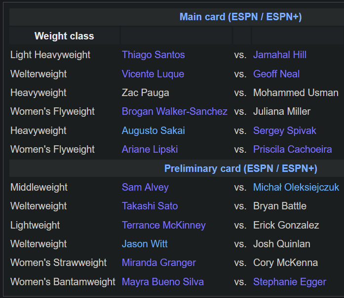 This is an exceedingly interesting fight. It's tempting to sum it up as an aggressive brawler in Vicente Luque vs a technically sound striker in Geoff Neal, but that's a woefully reductive read. Luque's danger isn't blind aggression, it's the patience he exhibits before he springs into action. It is entirely likely, however, that Luque's going to be leading the dance and Neal is going to be looking to jab, sling kicks and dance away. It wouldn't surprise me to see Luque mix in takedown attempts just to force Neal's hands down, but I wouldn't expect a lot of commitment to getting him on the ground.