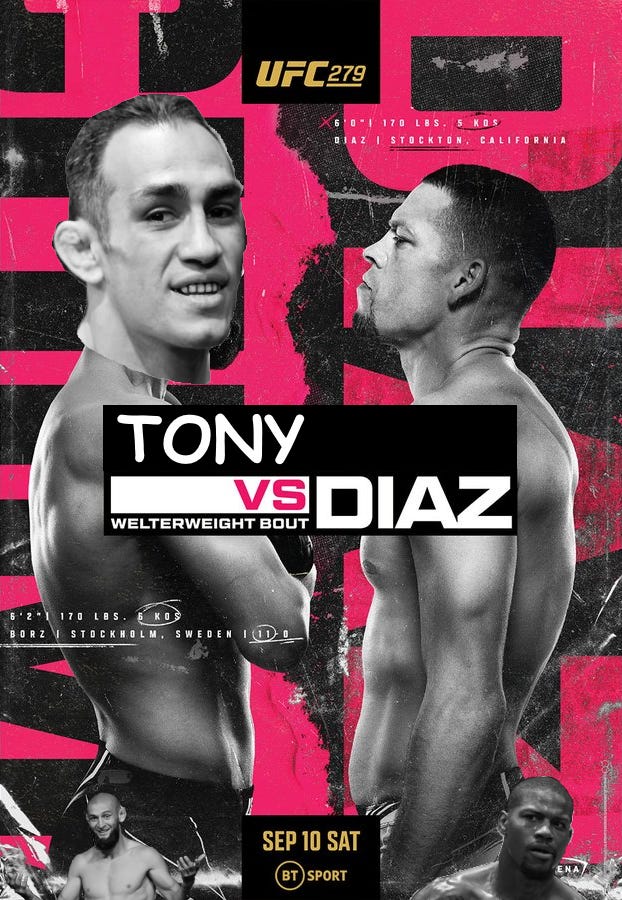 It would have been a genuinely interesting fight. While Tony and Nate have very different fighting styles, they hinged on the same strategy: Wearing opponents down with accumulated damage until they broke and either left themselves open for a submission or stopped fighting altogether. Where Tony liked to do it through constant motion, lots of mixed attacks and tearing people apart with elbows from inside the pocket, Nate liked to do it by standing in front of them and just punching them, frequently. Nate Diaz's best weapon in the clinch range is giving his opponents loud verbal updates with regards to their bitch/not bitch status. Two fighters at the top of both their divisions and their own athletic primes, both incredibly adept at hurting their opponents, both capable of taking unreal punishment without slowing down, both with the cardio to fight five rounds. The potential fireworks were off the charts.