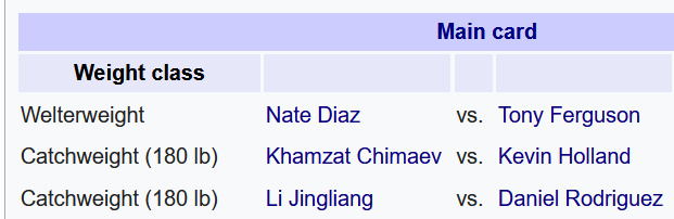 WELTERWEIGHT: Anthony Armand "Tony" Ferguson Padilla (25-7, #11 at Lightweight) vs Nathan Donald Diaz, Esq. (20-13, #209 everywhere else)