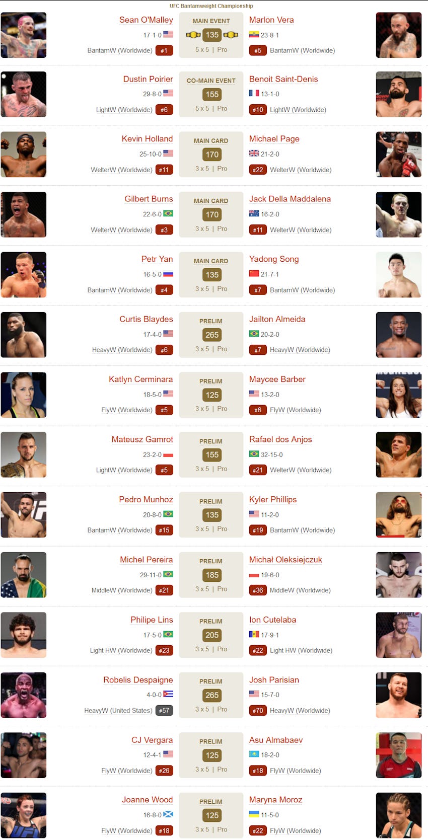 Is Sean O'Malley defending his Bantamweight title against rightful top contender Merab Dvalishvili or, indeed, any of the top contenders? No: He's fighting Marlon Vera, the #5 guy, who just lost to #3 and, debatably, #12 last year. Pedro Munhoz, the #12 guy who should be in Marlon's place? He's fighting an unranked man on the prelims.