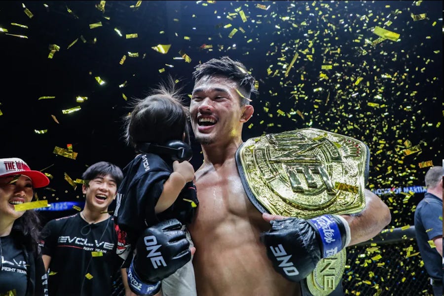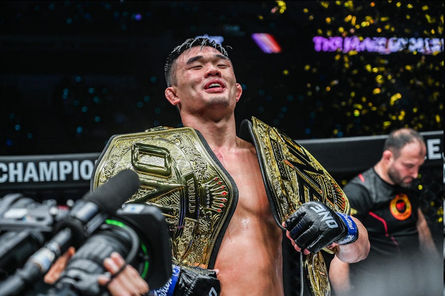 It took three tries, but by god, Chatri gets what Chatri wants. Christian Lee, the male half of the first family of ONE Championship and its homegrown golden boy, was very mad about losing his lightweight championship in a controversial decision to Ok Rae Yoon last year. He demanded the decision be reviewed and overturned and his championship reinstated. Unsurprisingly: This did not happen. After months of complaining and just shy of a year of waiting, the two had their long-awaited rematch and Lee left nothing to chance, knocking Yoon out in six minutes to reclaim his belt. Having finally retrieved his title, Lee, being a responsible champion, proceeded to immediately challenge ONE’S 185-pound champion, Kiamrian Abbasov, for his title, a move that was definitely in no way influenced by ONE’s repeated attempts to get his sister Angela Lee double-champion status. Fortunately for Christian, Abbasov horribly botched his weight cut: He came in overweight, lost his title on the scale, and was visibly depleted in the fight. Which is particularly lucky, because Abbasov beat Lee senseless in the first round to the point that a standing TKO would not have been an unreasonable stoppage. But whether from his failed weight cut or simply from punching himself out, Abbasov was exhausted by the second round, and Lee mounted a gutsy comeback and ultimately stopped him with ground-and-pound in the fourth round. After three attempts, ONE has succeeded in getting two belts on a Lee. Unfortunately, it was followed by tragedy. After the passing of his younger sister Victoria, Christian took the whole of the year to, understandably, grieve. ONE planned his comeback for February of 2024, but, y’know, that clearly did not happen. ONE held an interim title fight between Alibeg Rasulov and Ok Rae Yoon to welcome him back--but that didn’t exactly happen either, as Rasulov failed hydration tests, became ineligible to win the title, then won the fight anyway. Lee vs Rasulov was scheduled for October. And then November. It finally happened on December 7, 2024--and it ended in a No Contest after two rounds thanks to Christian unintentionally gouging Rasulov’s eye. They ran it back almost a full year later at ONE 173 on November 16, and this time Lee knocked him out in the second round, marking Lee’s first win in three years.