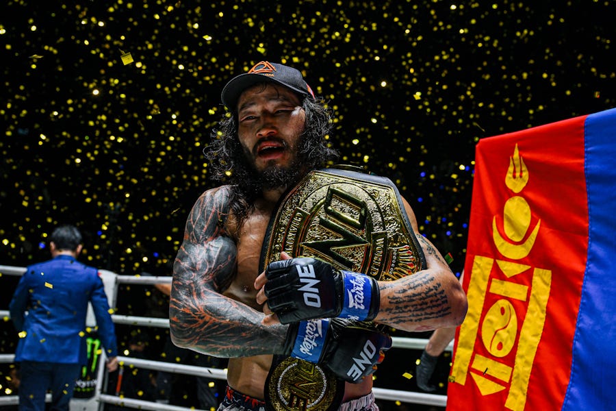 By god, ONE had an MMA title change hands in 2025. Enkh-Orgil Baatarkhuu is one of the precious few success stories for ONE’s feeder system. He was a 5-2 champion in the small (but competitive!) regional scene in his native Mongolia, which put him on ONE’s talent-scouting radar for their Warriors of the Steppe tournament in 2022. Enkh won two fights in six days to earn his contract with ONE, where he quickly discovered that no matter where you go in the wide world of sports, being a grappler-type Pokemon makes companies less invested in promoting you. Enkh went 6-1 across two years--8-1, if you count those aforementioned tournament wins--and finished most of his opponents, but title contention eluded him in no small part thanks to ONE’s turn away from mixed martial arts as a whole. It wasn’t until December 6 that Enkh finally got his long-belated shot at Fabricio Andrade’s Bantamweight title, and the first round and a half looked pretty thoroughly one-sided in Andrade’s favor, as most had figured it would be given the gap in Enkh’s striking game, and Andrade battered him to a near-stoppage on a couple occasions. But Enkh, as it turns out, is tough as shit. He weathered the storm and used his grit, his power and his wrestling to turn the tables, and towards the end of the fourth round, an exhausted Andrade gave up the ghost and got himself strangled. Enkh-Orgil Baatarkhuu is ONE’s Bantamweight champion, and his very first act as a champion was to call for a cross-class title match with Tang Kai, because weight classes aren’t real.