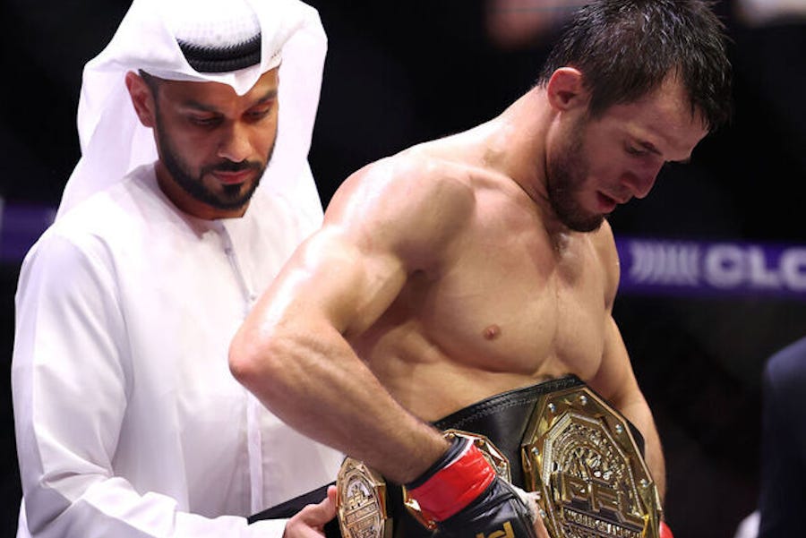 The prophecy has been fulfilled. Khabib Nurmagomedov was considered by many to be the greatest Lightweight of all time, but in the later stages of his career he began to repeatedly reference his lifetime friend and training partner Islam Makhachev as not just his successor, but the man who would break the mold he’d left behind. And the fanbase was more than willing to buy another Abdulmanap Nurmagomedov protege coming in and wrecking shop--until he got knocked out by Adriano Martins. Khabib’s aura of invulnerability came from the simple, so-obvious-more-people-should-try-it factor of simply never losing a damn fight. When Islam got torched in under two minutes by a man that couldn’t beat Donald Cerrone, that aura vanished. A lot of folks still thought he could be a champion, but most felt the greatest-of-all-time lane was closed to him. It turns out there’s another way to regain that sense of unbeatable awe, though: Just don’t lose for so goddamn long people forget it ever happened. In the ten full years since that Martins bout, Islam has not lost a single fight. Most of the time, he hasn’t even lost a round. He worked his way up the Lightweight ladder and began to rack up incredible achievements. He tore through top prospects with virtually no effort, he choked out one of the best MMA grapplers ever in Charles Oliveira, he outlasted and later knocked out one of the two men with a claim to the all-time Featherweight crown in Alexander Volkanovski, he choked out Dustin Poirier and he broke the Lightweight title defense record after stomping Renato Moicano. And then he traded in his record-breaking reign to challenge for Welterweight gold. Jumping divisions is always difficult, but the 15-pound leap from Lightweight to Welterweight is a mountain, and no Lightweight champion had ever managed it. Even BJ Penn, the canonical first man to hold gold at both, had to do it in reverse: He failed at both of his attempts to win Lightweight gold and shocked the world by abruptly taking it at Welterweight instead, and it would be five more years before he finally got his shit together and won a title in the division that made him famous. His subsequent attempts all ended in defeat, half because Matt Hughes and Georges St-Pierre were both great and half because BJ was just a Lightweight. Even though Islam was Islam and widely agreed to be a monster in the cage, Jack Della Maddalena had won the Welterweight title with some of the cleanest boxing the UFC had seen, and his championship victory over wrestler Belal Muhammad had people convinced that Islam, at best, would struggle. They met in the main event of UFC 322 on November 15, 2025, and there was absolutely no struggle. Islam kicked Jack’s leg to pieces, landed some surprisingly big punches, and took the fight to the ground almost at will, and by the time the fight ended, it felt like Jack never had a chance. The shadow has been stepped out of. Islam Makhachev is a two-division champion. And now he has a brand new horde of contenders beating down his door.