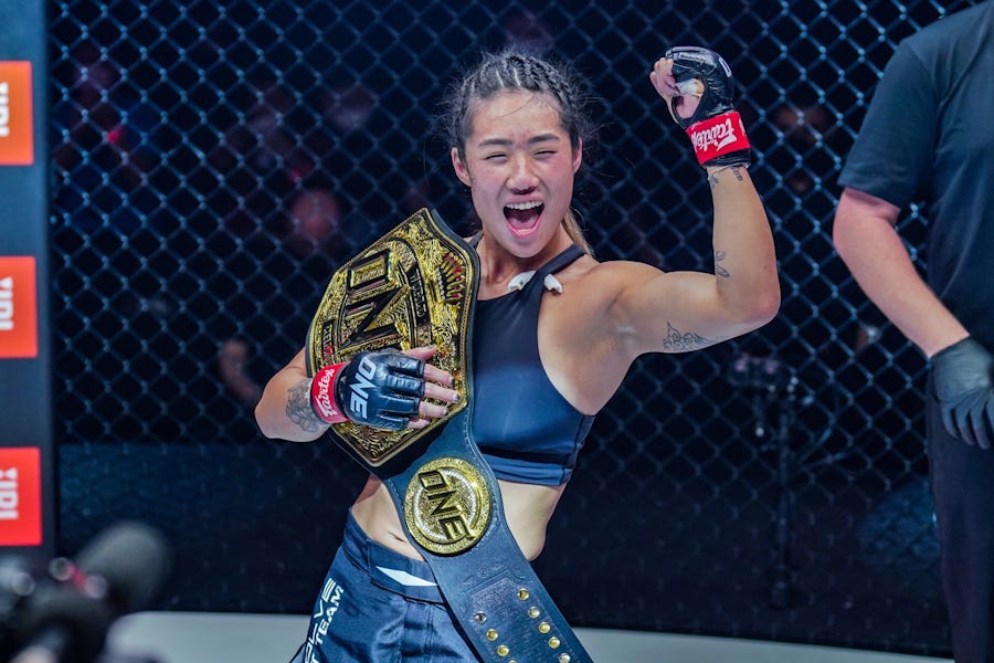 Xiong Jing Nan dreamed of lifting weights. She'd enjoyed sports as a child, and when China started its national push for Olympic supremacy she began training heavily in hope of joining the national weightlifting team. But then she met aspirants for its boxing team and fell in love with the idea of living out a martial arts movie and getting to hit people for fun and profit and she never looked back. She turned pro in 2014 and immediately became a standout, going 9-1 in China's Kunlun Fight promotion with wins across three separate weight classes. What made her truly dangerous wasn't one-punch power, but the ability to break her opponents with constant pressure striking, scoring TKOs with combinations stretched out across dozens of consecutive, unending strikes. The story was no different when she moved to ONE in 2017, and she was strawweight champion within two fights. ONE's women's MMA divisions have been its most stable, each having had exactly one champion, and they were so dominant that they inevitably had to fight each other--and, hilariously, traded wins back and forth in the process. 115 lbs champion Angela Lee went up to 125 to challenge for Xiong Jing Nan's belt but Nan stopped her with body kicks in the fifth round, and half a year later Nan dropped down to 115 to challenge for Lee's belt only for Lee to choke her out with twelve seconds left in the fight. Xiong has notched three successful title defenses since, which set her up for her greatest challenger yet: Angela Lee, again, apparently. Despite ONE's best attempts, Xiong successfully defended her title against Lee again, nearly finishing her in the first round and ultimately winning a decision.