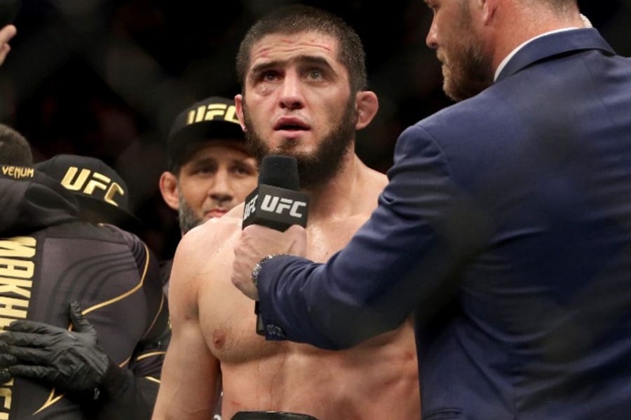 Destiny has come. When Islam Makhachev made his UFC debut in 2015, Khabib Nurmagomedov, considered by most to be the #1 contender and soon to be the best in the world, swore up and down that Makhachev, not him, would be the best lightweight champion of all time. Coming from him, the praise made sense: Khabib and Islam have trained together since they were children growing up and learning to wrestle in Makhachkala. Islam learned under Khabib's father, trained with Khabib's team and even made the pilgrimage to America to join Khabib at the American Kickboxing Academy. And then, two matches into his UFC tenure, Islam got knocked the fuck out in the first round by the little-known Adriano Martins, who hasn't won a fight in the six years since. Even as Makhachev racked up wins, the memory of his loss and his wrestling-heavy approach to his fights let people cast doubts on him. Sure, he's good--but he lost, so he's not as good as Khabib. Islam Makhachev, as his trainer tells it, never wanted to be Khabib. He loves fighting, but he doesn't love the spectacle or the glory or the attention. So when, after ten straight wins, Makhachev was picked to challenge Charles Oliveira for the vacant title he never truly lost, a lot of folks just weren't quite sure what to think. Sure, he was an incredible wrestler, but Charles Oliveira is a submission wizard, and sure, he's on a ten-fight streak, but he hasn't fought a single person actually IN the top ten, and Oliveira represents a huge, dangerous step up as a man who's been destroying some of the most accomplished lightweights in the sport's history. Analyst opinion was split right down the middle; the fight, as it turned out, was nowhere near that competitive, and the only analyst who was entirely correct was Khabib. Islam demolished the former champion, outstriking him, taking him down at will, controlling him in the grappling, and ultimately dropping him with punches and choking him out in the second round. His first defense was a different story. Islam faced featherweight champion Alexander Volkanovski at UFC 284 on February 12th in a rare best-of-the-best, champion vs champion match, and this time, his team's prediction of domination was thoroughly incorrect: It was a pitched battle that ended with Makhachev visibly exhausted and Volkanovski pounding on his face. Islam took an extremely close decision and the divisions will remain separate, but his aura of invulnerability has been thoroughly punctured.